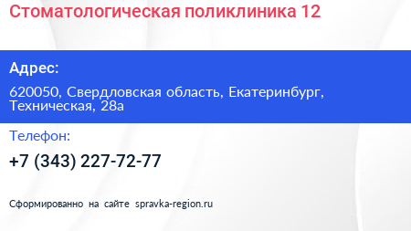 Стоматологическая поликлиника №12 по адресу 620050, Свердловская область, Екатеринбург, Техническая, 28а в дальнейшем Организация, размещена в следующих категориях: