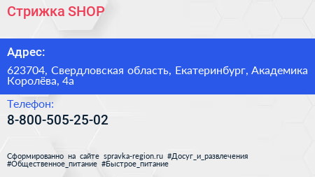 Стрижка-SHOP по адресу 623704, Свердловская область, Екатеринбург, Академика Королёва, 4а в дальнейшем Организация, размещена в следующих категориях: