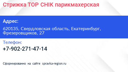 Стрижка TOP-CHIK, парикмахерская по адресу 620135, Свердловская область, Екатеринбург, Фрезеровщиков, 27 в дальнейшем Организация, размещена в следующих категориях: