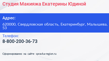 Студия Макияжа Екатерины Юдиной по адресу 620000, Свердловская область, Екатеринбург, Малышева, 53 в дальнейшем Организация, размещена в следующих категориях: