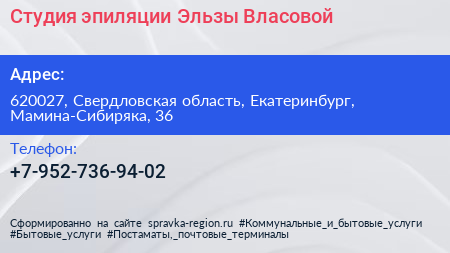 Студия эпиляции Эльзы Власовой по адресу 620027, Свердловская область, Екатеринбург, Мамина-Сибиряка, 36 в дальнейшем Организация, размещена в следующих категориях: