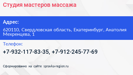 Студия мастеров массажа по адресу 620110, Свердловская область, Екатеринбург, Анатолия Мехренцева, 1 в дальнейшем Организация, размещена в следующих категориях: