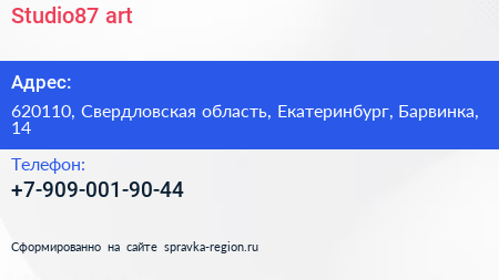 Studio87.art по адресу 620110, Свердловская область, Екатеринбург, Барвинка, 14 в дальнейшем Организация, размещена в следующих категориях: