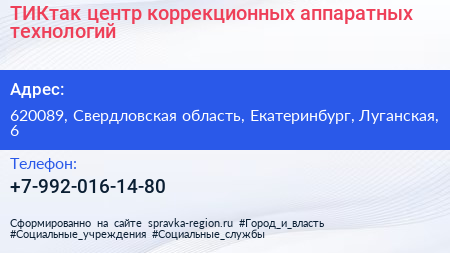 ТИКтак, центр коррекционных аппаратных технологий по адресу 620089, Свердловская область, Екатеринбург, Луганская, 6 в дальнейшем Организация, размещена в следующих категориях: