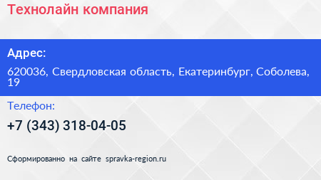 Технолайн, компания по адресу 620036, Свердловская область, Екатеринбург, Соболева, 19 в дальнейшем Организация, размещена в следующих категориях:
