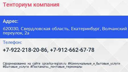 Тенториум, компания по адресу 620030, Свердловская область, Екатеринбург, Волчанский переулок, 2а в дальнейшем Организация, размещена в следующих категориях:
