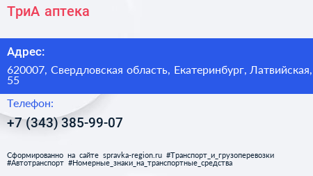 ТриА, аптека по адресу 620007, Свердловская область, Екатеринбург, Латвийская, 55 в дальнейшем Организация, размещена в следующих категориях: