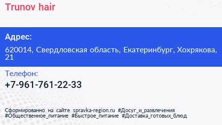 Trunov-hair по адресу 620014, Свердловская область, Екатеринбург, Хохрякова, 21 в дальнейшем Организация, размещена в следующих категориях: