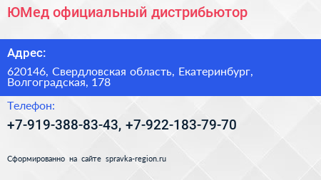 ЮМед, официальный дистрибьютор по адресу 620146, Свердловская область, Екатеринбург, Волгоградская, 178 в дальнейшем Организация, размещена в следующих категориях: