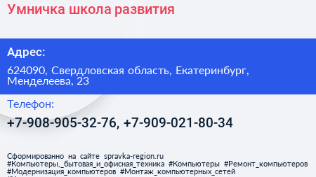 Умничка, школа развития по адресу 624090, Свердловская область, Екатеринбург, Менделеева, 23 в дальнейшем Организация, размещена в следующих категориях: