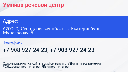 Умница, речевой центр по адресу 620050, Свердловская область, Екатеринбург, Маневровая, 9 в дальнейшем Организация, размещена в следующих категориях: