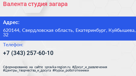 Валента, студия загара по адресу 620144, Свердловская область, Екатеринбург, Куйбышева, 32 в дальнейшем Организация, размещена в следующих категориях: