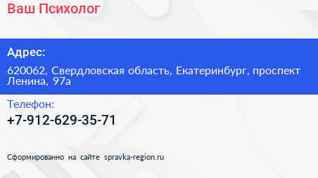 Ваш Психолог по адресу 620062, Свердловская область, Екатеринбург, проспект Ленина, 97а в дальнейшем Организация, размещена в следующих категориях: