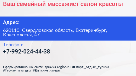 Ваш семейный массажист, салон красоты по адресу 620110, Свердловская область, Екатеринбург, Краснолесья, 47 в дальнейшем Организация, размещена в следующих категориях: