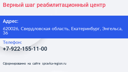 Верный шаг, реабилитационный центр по адресу 620026, Свердловская область, Екатеринбург, Энгельса, 36 в дальнейшем Организация, размещена в следующих категориях: