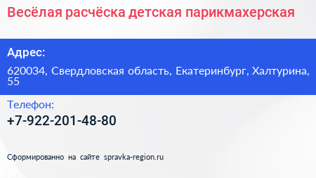 Весёлая расчёска, детская парикмахерская по адресу 620034, Свердловская область, Екатеринбург, Халтурина, 55 в дальнейшем Организация, размещена в следующих категориях: