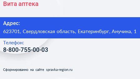 Вита, аптека по адресу 623701, Свердловская область, Екатеринбург, Анучина, 1 в дальнейшем Организация, размещена в следующих категориях: