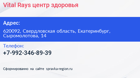 Vital Rays, центр здоровья по адресу 620092, Свердловская область, Екатеринбург, Сыромолотова, 14 в дальнейшем Организация, размещена в следующих категориях: