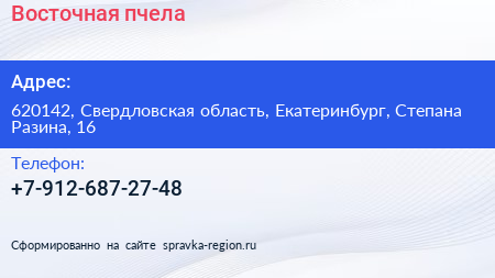 Восточная пчела по адресу 620142, Свердловская область, Екатеринбург, Степана Разина, 16 в дальнейшем Организация, размещена в следующих категориях: