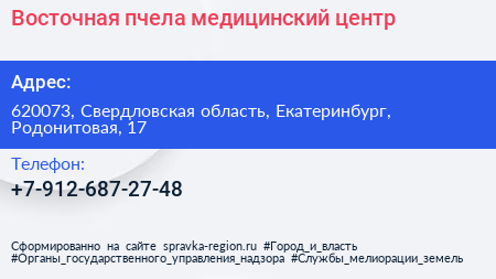 Восточная пчела, медицинский центр по адресу 620073, Свердловская область, Екатеринбург, Родонитовая, 17 в дальнейшем Организация, размещена в следующих категориях:
