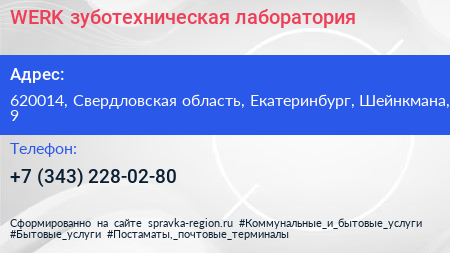 WERK, зуботехническая лаборатория по адресу 620014, Свердловская область, Екатеринбург, Шейнкмана, 9 в дальнейшем Организация, размещена в следующих категориях: