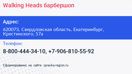 Walking Heads, барбершоп по адресу 620073, Свердловская область, Екатеринбург, Крестинского, 57а в дальнейшем Организация, размещена в следующих категориях: