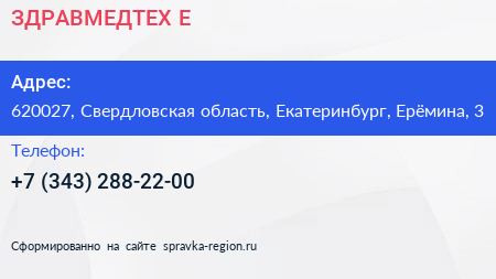 ЗДРАВМЕДТЕХ-Е по адресу 620027, Свердловская область, Екатеринбург, Ерёмина, 3 в дальнейшем Организация, размещена в следующих категориях: