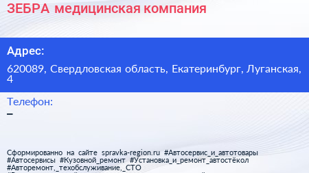 ЗЕБРА, медицинская компания по адресу 620089, Свердловская область, Екатеринбург, Луганская, 4 в дальнейшем Организация, размещена в следующих категориях: