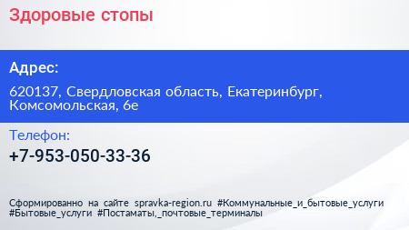 Здоровые стопы по адресу 620137, Свердловская область, Екатеринбург, Комсомольская, 6е в дальнейшем Организация, размещена в следующих категориях: