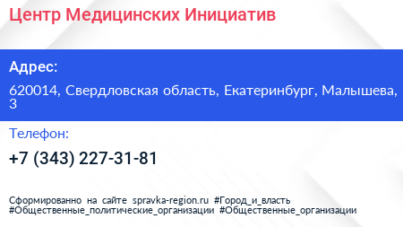 Центр Медицинских Инициатив по адресу 620014, Свердловская область, Екатеринбург, Малышева, 3 в дальнейшем Организация, размещена в следующих категориях:
