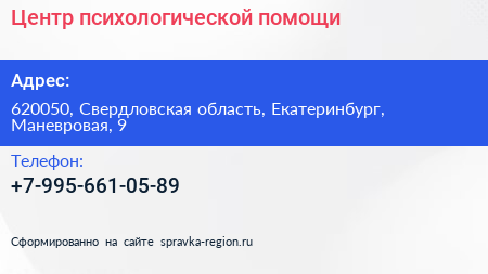 Центр психологической помощи по адресу 620050, Свердловская область, Екатеринбург, Маневровая, 9 в дальнейшем Организация, размещена в следующих категориях: