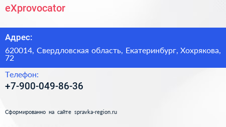 eXprovocator по адресу 620014, Свердловская область, Екатеринбург, Хохрякова, 72 в дальнейшем Организация, размещена в следующих категориях: