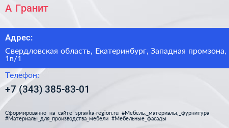 А-Гранит по адресу Свердловская область, Екатеринбург, Западная промзона, 1в/1 в дальнейшем Организация, размещена в следующих категориях: