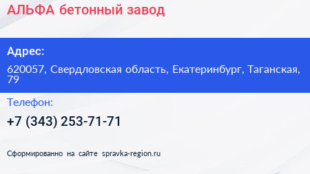 АЛЬФА, бетонный завод по адресу 620057, Свердловская область, Екатеринбург, Таганская, 79 в дальнейшем Организация, размещена в следующих категориях: