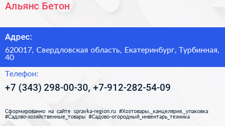 Альянс Бетон по адресу 620017, Свердловская область, Екатеринбург, Турбинная, 40 в дальнейшем Организация, размещена в следующих категориях: