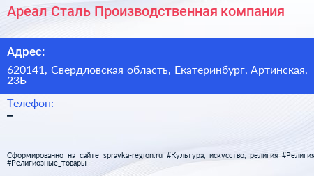Ареал-Сталь, Производственная компания по адресу 620141, Свердловская область, Екатеринбург, Артинская, 23Б в дальнейшем Организация, размещена в следующих категориях: