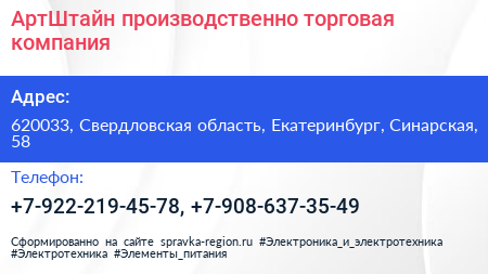 АртШтайн, производственно-торговая компания по адресу 620033, Свердловская область, Екатеринбург, Синарская, 58 в дальнейшем Организация, размещена в следующих категориях: