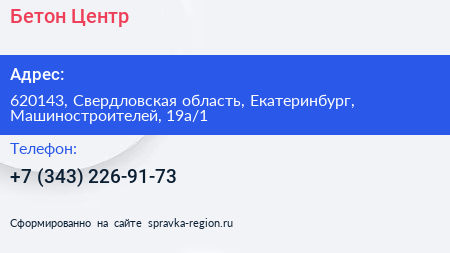 Бетон-Центр по адресу 620143, Свердловская область, Екатеринбург, Машиностроителей, 19а/1 в дальнейшем Организация, размещена в следующих категориях:
