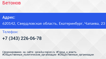 Бетонов по адресу 620142, Свердловская область, Екатеринбург, Чапаева, 23 в дальнейшем Организация, размещена в следующих категориях: