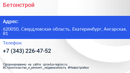 Бетонстрой по адресу 620050, Свердловская область, Екатеринбург, Ангарская, 81 в дальнейшем Организация, размещена в следующих категориях: