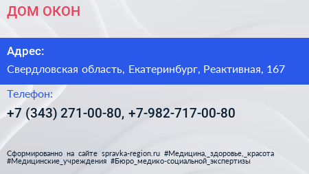 ДОМ ОКОН по адресу Свердловская область, Екатеринбург, Реактивная, 167 в дальнейшем Организация, размещена в следующих категориях: