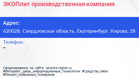 ЭКОПлит, производственная компания по адресу 620028, Свердловская область, Екатеринбург, Кирова, 28 в дальнейшем Организация, размещена в следующих категориях: