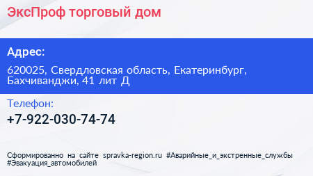 ЭксПроф, торговый дом по адресу 620025, Свердловская область, Екатеринбург, Бахчиванджи, 41 лит Д в дальнейшем Организация, размещена в следующих категориях: