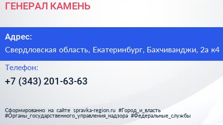 ГЕНЕРАЛ КАМЕНЬ по адресу Свердловская область, Екатеринбург, Бахчиванджи, 2а к4 в дальнейшем Организация, размещена в следующих категориях: