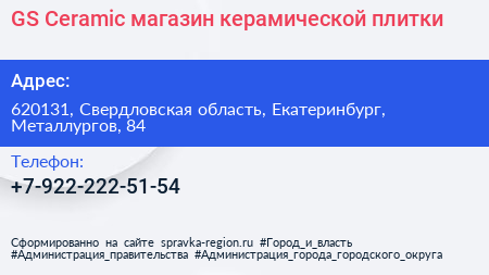 GS Ceramic, магазин керамической плитки по адресу 620131, Свердловская область, Екатеринбург, Металлургов, 84 в дальнейшем Организация, размещена в следующих категориях: