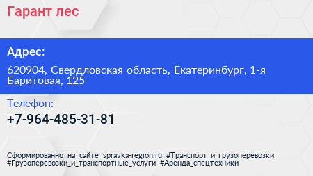 Гарант-лес по адресу 620904, Свердловская область, Екатеринбург, 1-я Баритовая, 125 в дальнейшем Организация, размещена в следующих категориях: