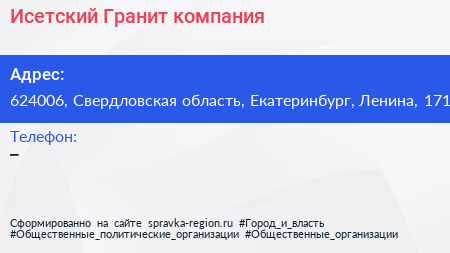 Исетский Гранит, компания по адресу 624006, Свердловская область, Екатеринбург, Ленина, 171 в дальнейшем Организация, размещена в следующих категориях: