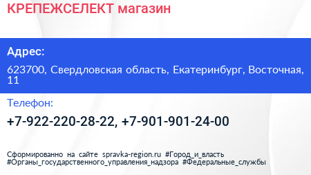 КРЕПЕЖСЕЛЕКТ, магазин по адресу 623700, Свердловская область, Екатеринбург, Восточная, 11 в дальнейшем Организация, размещена в следующих категориях: