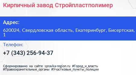 Кирпичный завод-Стройпластполимер по адресу 620024, Свердловская область, Екатеринбург, Бисертская, 1 в дальнейшем Организация, размещена в следующих категориях:
