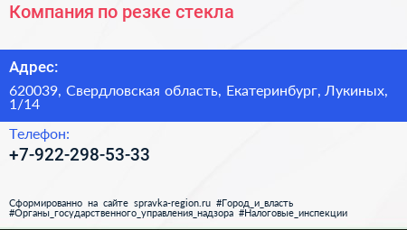 Компания по резке стекла по адресу 620039, Свердловская область, Екатеринбург, Лукиных, 1/14 в дальнейшем Организация, размещена в следующих категориях: